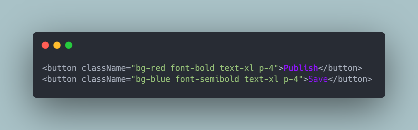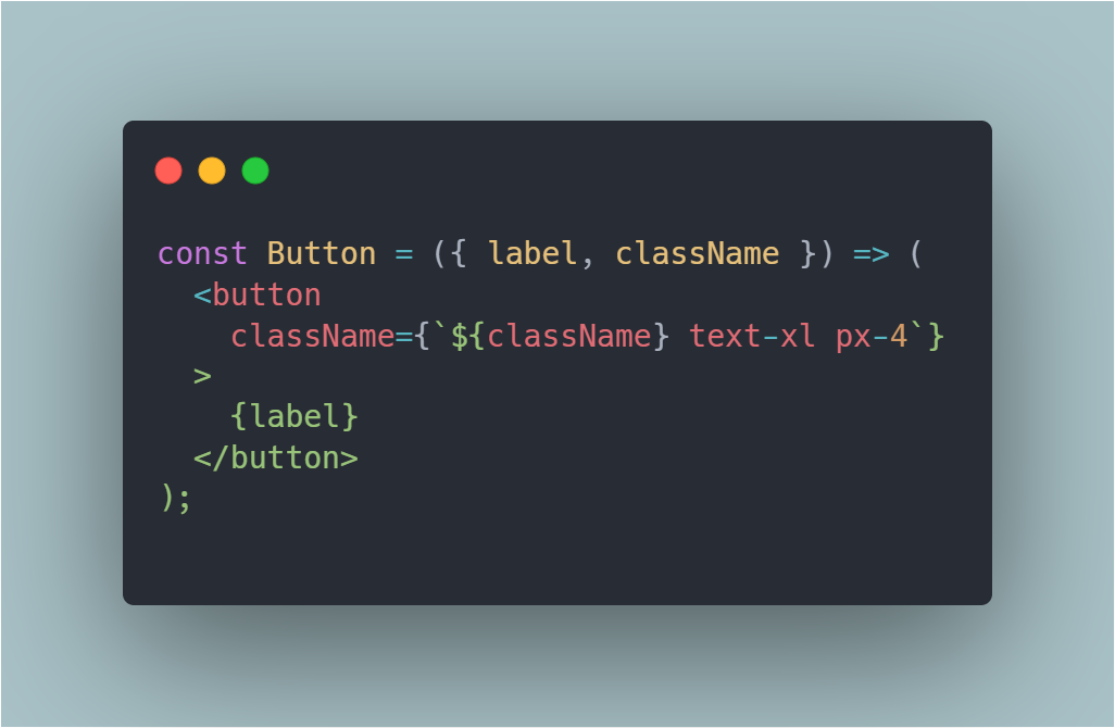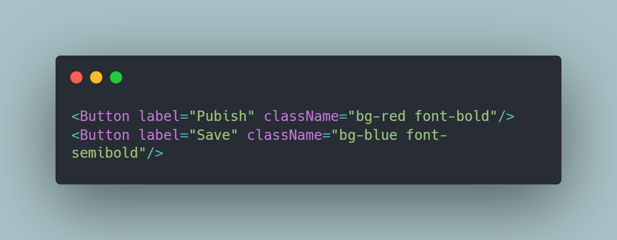 These are two buttons now we have to identify some patterns to make them reusable like they are both buttons with two different styles and labels. Notice the similarities and differences .The similarities can be used to make a base reusable component which takes the differences as props and make different variations of the buttons. In this case we can make a reusable button that take className and label as props to fulfill our requirements.