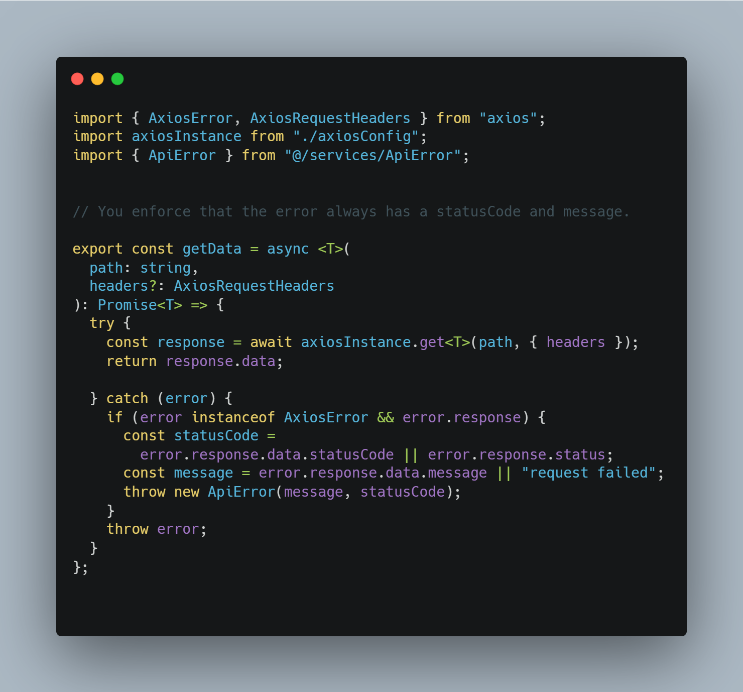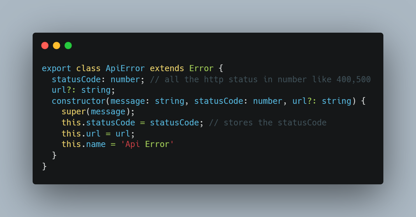 iii. Using ApiError (extending the native Error) allows us to include statusCode and other metadata, which is useful when displaying in Error Boundaries. ( which is described briefly on 1.3 )
