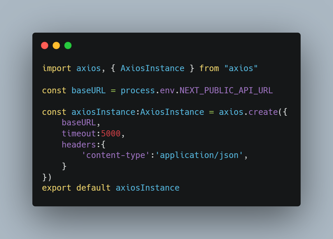 - Here , AxiosInstance creates and exports a preconfigured Axios instance with a base URL, timeout, and JSON headers — ready for API calls.