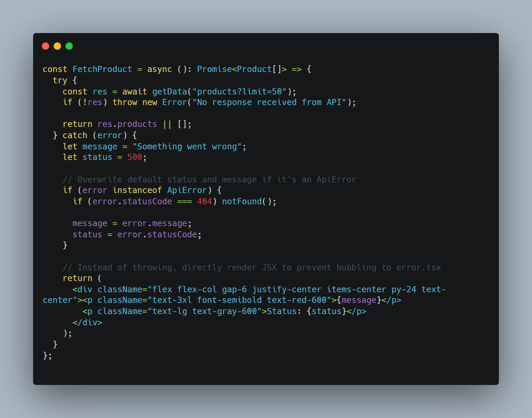 Here, we return JSX instead of throwing an error. Throwing an error ( i.e throw error in catch block ) triggers the error.tsx which is the same process as with serialization, which can cause issues with 400 status codes in production.