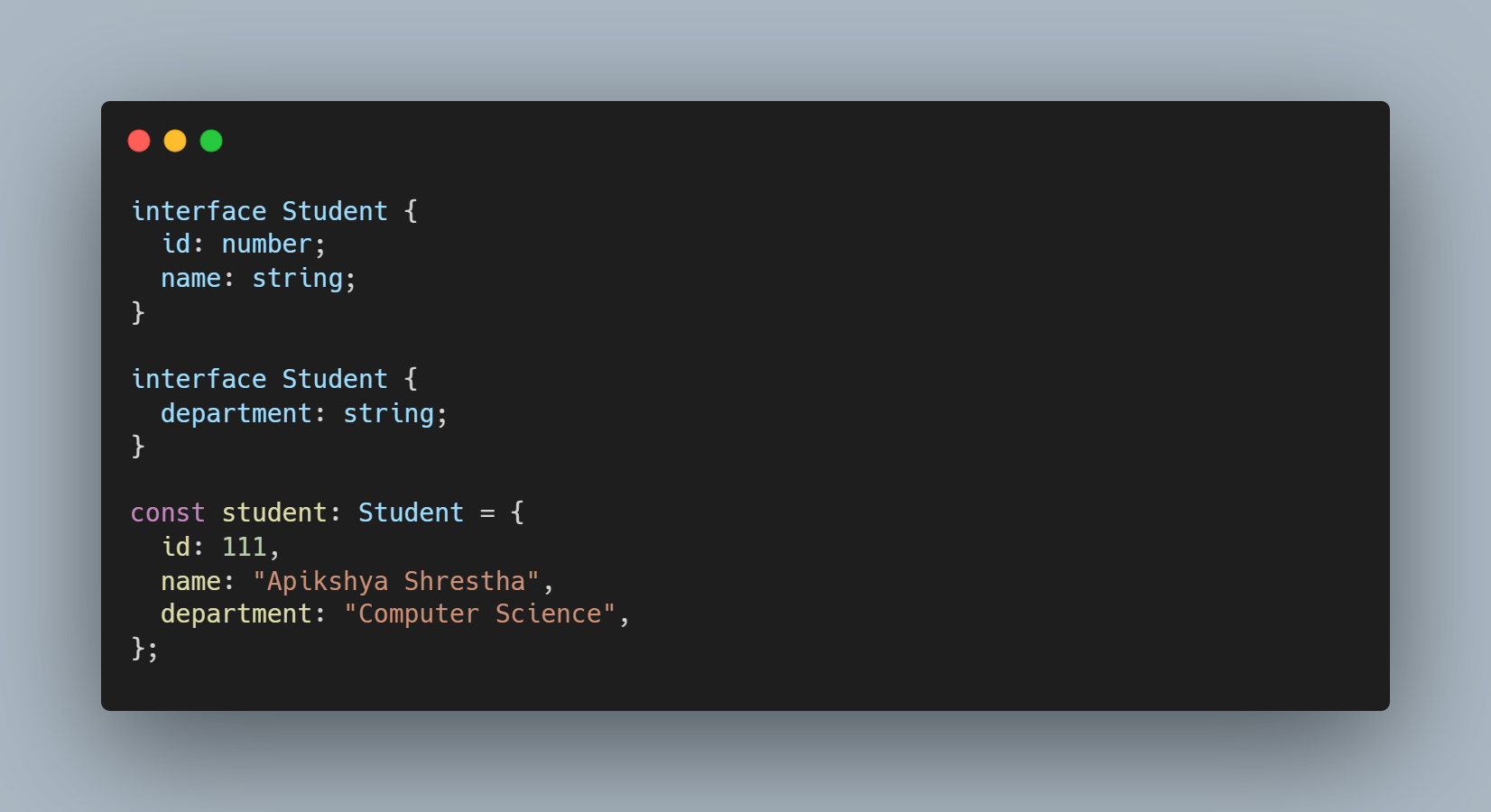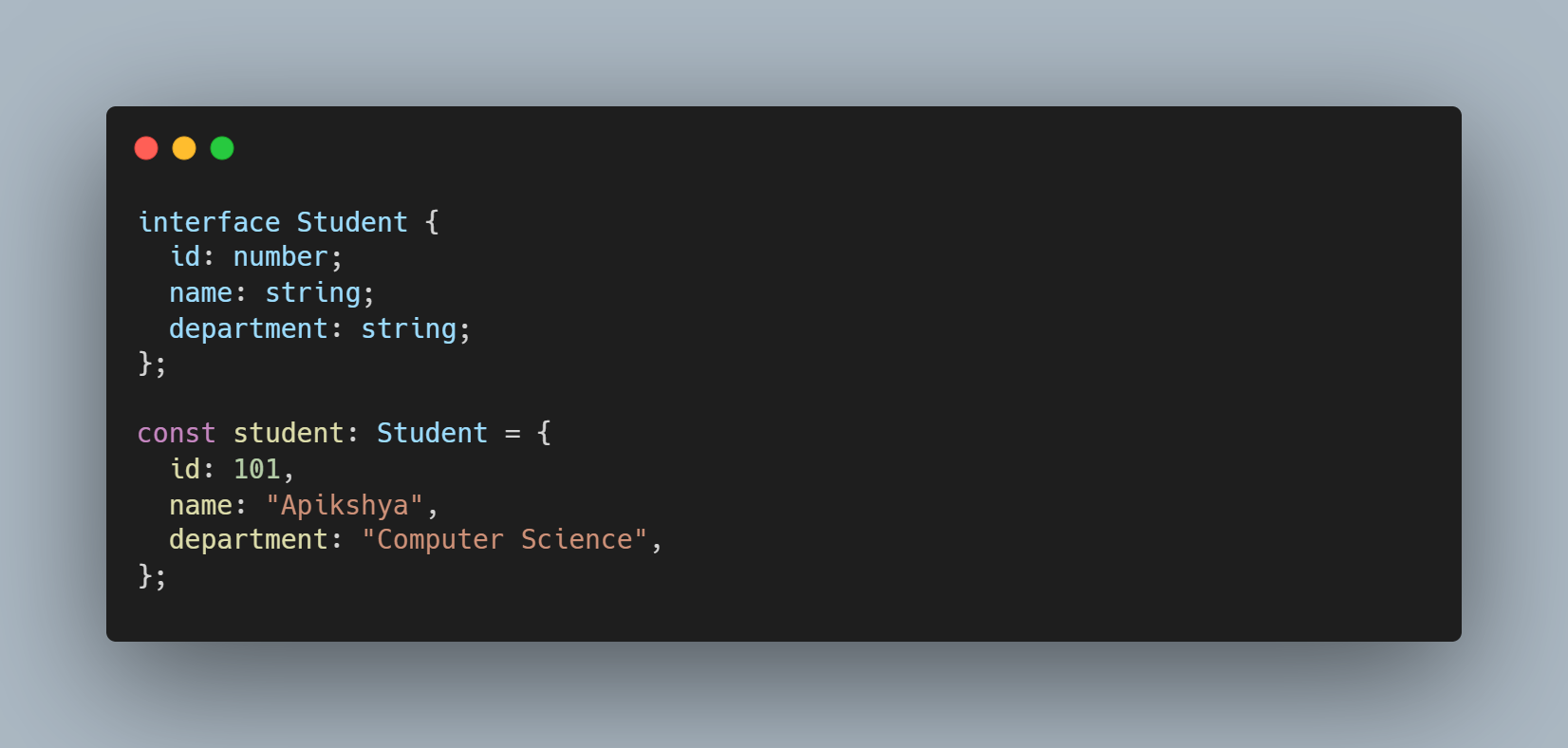 We can define an object’s structure in TypeScript using either an interface or a type . Both specify what properties an object should have and their types.