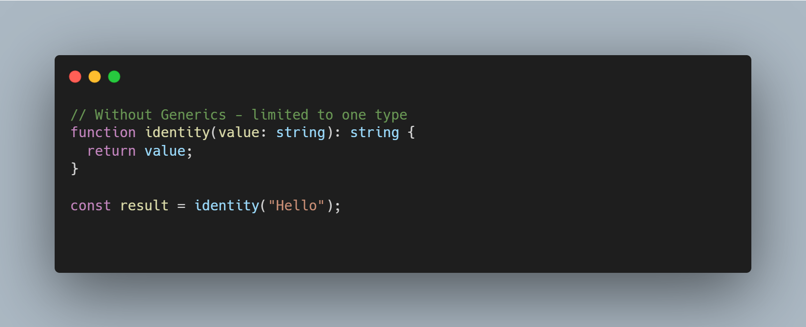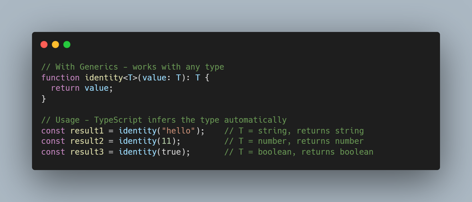 <T>= Type parameter (placeholder for actual type)value: T= Parameter of type T: T= Returns same type T