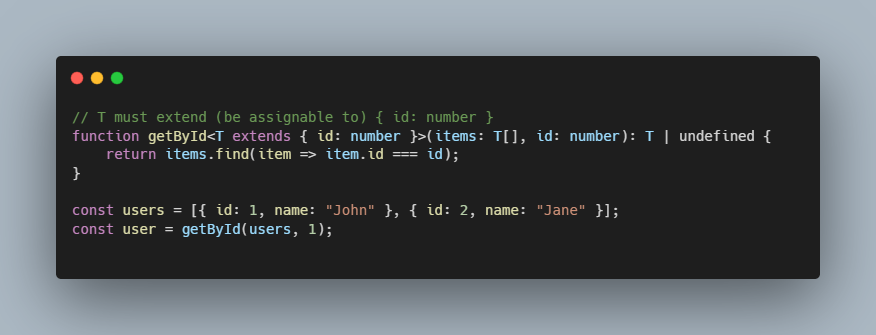 <T extends { id: number }>meansTmust be an object that has at least anidproperty of typenumber - Parameters: