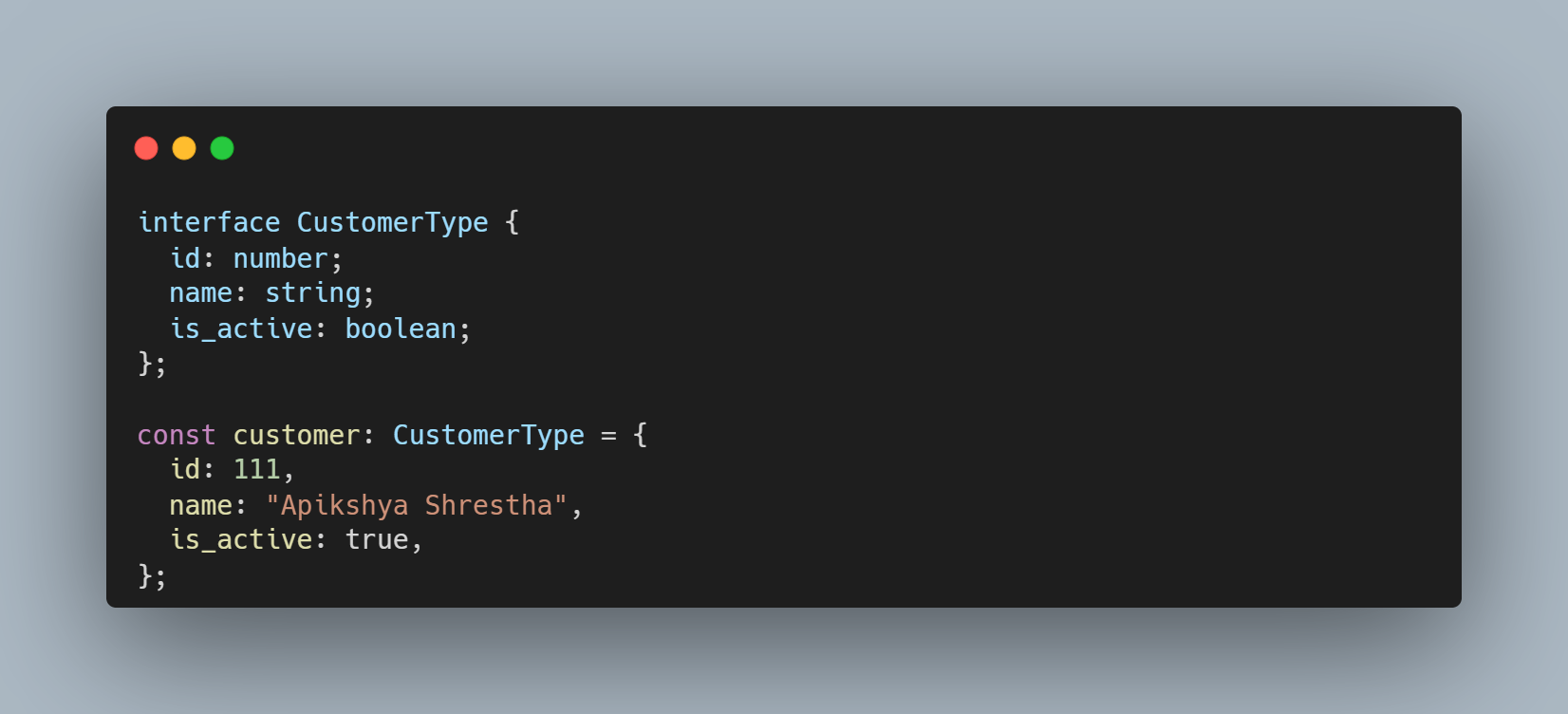 interface CustomerType: Declares a new interfaceid: number: Requires a numericidpropertyname: string: Requires a stringnamepropertyis_active: boolean: Requires a booleanis_activepropertyconst customer: CustomerType: Creates a constant variablecustomerthat must follow theCustomerTypeinterface- The object must include all three properties with the correct types